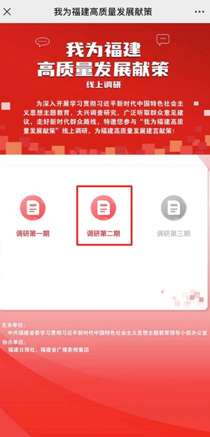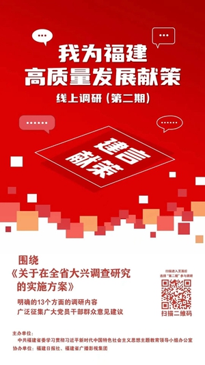 “我为福建高质量发展献策”线上调研由中共福建省委学习贯彻习近平新时代中国特色社会主义思想主题教育领导小组办公室主办,福建日报社、福建省广播影视集团协办。
