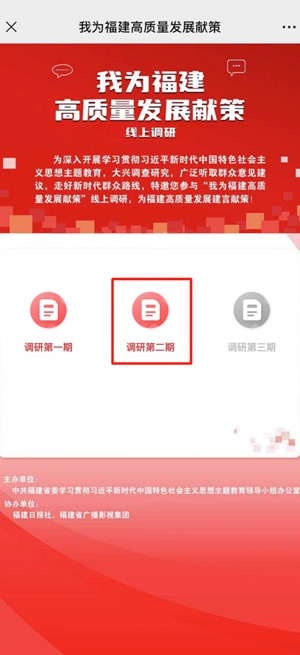 “我为福建高质量发展献策”线上调研第二期调查研究围绕《关于在全省大兴调查研究的实施方案》明确的13个方面的调研内容,广泛征集广大党员干部群众意见建议,诚邀社会各界积极参与。