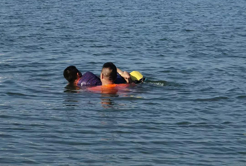 “我去到落水处时,他已经被海水带出去了一段距离。”赖国生跳入海里,游到男孩身边,将他一把拉起,并把救生棒塞到其怀中让他抱住。赖国生一边安慰男孩,一边拉着救生棒的一端,将男孩往海滩上带。